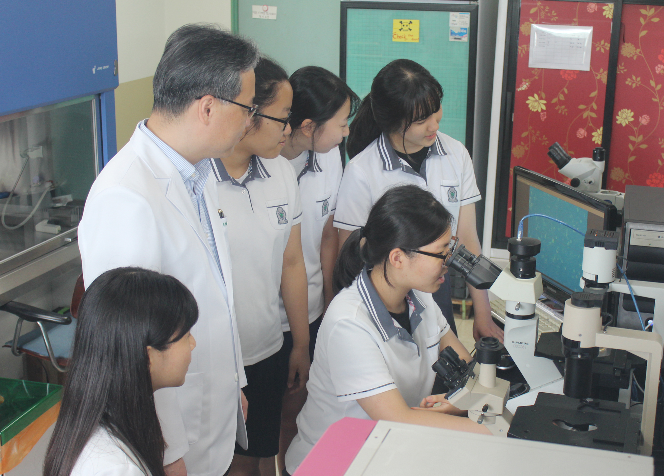 건양의대 박창교 부학장과 충남여고 학생들이 실험을 하는 모습.JPG