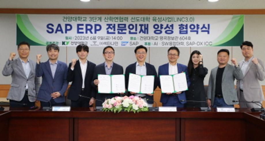 건양대학교(총장 김용하) AI·SW융합대학(학장 김용석)은 9일 오후 기업용 ERP 소프트웨어 세계 1위 기업 SAP와 SPC의 IT서비스 및 마케팅 전문 계열사 섹타나인(Secta9ine)과 소프트웨어 인재육성 및 저변확대를 위해 상호 협력하는 내용의 업무협약을 체결했다고 밝혔다.