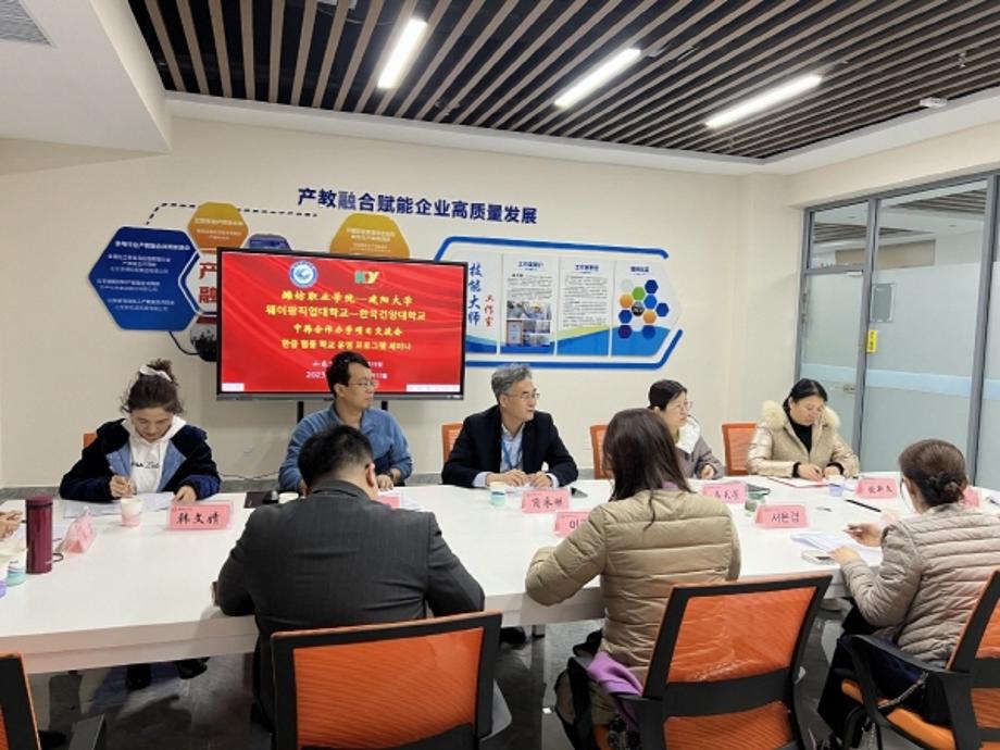 인영강 웨이팡직업대학교 국제교류 및 협력처 차장, 마천방 화학공정대학 부원장, 왕맹 화학공정대학 화장품기술전공 학과장 등이 참여한 가운데 11월 23일 웨이팡직업대학에서 열린 한중 합작 프로그램 교류협의회에서는 2021년에 체결한 교육프로그램 평가와 2024 체결할 교육과정체계가 협의됐다.