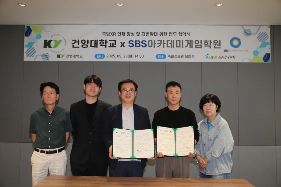 건양대, SBS아카데미게임학원과 국방XR 인재 양성 위한 업무협약 체결 건양대학교(총장 김용하) SW중심대학사업단(단장 김용석)은 9월 23일 SBS아카데미게임학원(대표 강경훈)과 국방XR 인재 양성을 위한 업무협약(MOU)을 체결했다고 밝혔다. 이번 협약은 국방산업 발전과 XR(확장현실) 기반 첨단 기술을 겸비한 융합형 인재 육성을 상호 협력 체계를 통해 구축하는 것을 목표로 한다.